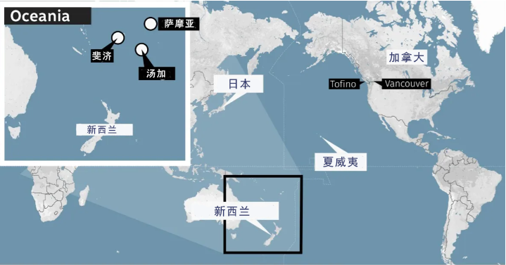 除湯加外,斐濟(jì)、薩摩亞、瓦努阿圖等國(guó)部分地區(qū)也海水活動(dòng)異常,這些國(guó)家都緊急發(fā)布了海嘯預(yù)警。此外,日本、美國(guó)、加拿大、新西蘭、澳大利亞和智利也都發(fā)布了海嘯預(yù)警。