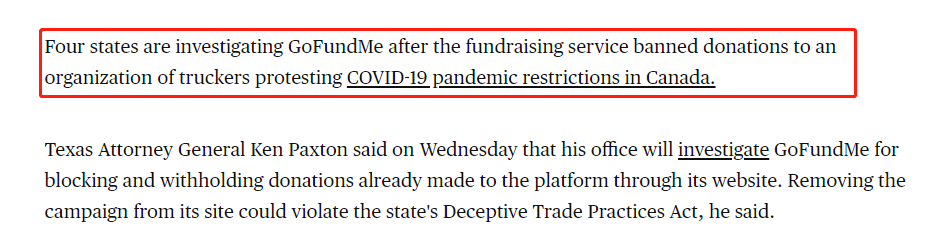 而在這家眾籌網(wǎng)站移除了為加拿大此次抗議活動募款的頁面后,美國有四個州對其展開了調(diào)查。