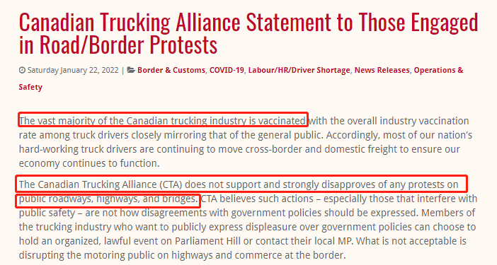 加拿大最大的卡車司機工會之一——加拿大貨車運輸業(yè)聯(lián)盟(Canadian Trucking Alliance)已公開表示反對抗議活動。