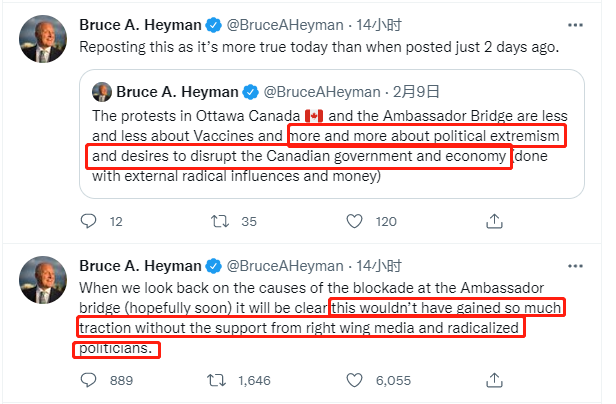 他在社交媒體上指出,此次抗議越來越多地偏離了疫苗議題,越來越多地體現(xiàn)出“政治極端主義”、“搞垮加拿大政府和經(jīng)濟”的傾向。“沒有右翼媒體和極端主義政客的推波助瀾,阻斷大使橋(北美最繁忙的國際邊境口岸)的行動不會獲得如此程度的推動。”