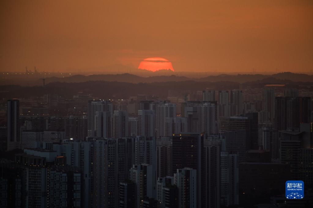 5月10日,人們?cè)谛录悠聞P源大廈觀賞日落。