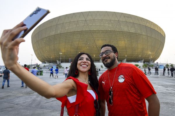 9月9日,球迷在中企承建的盧賽爾體育場(chǎng)前自拍留念。(新華社發(fā))