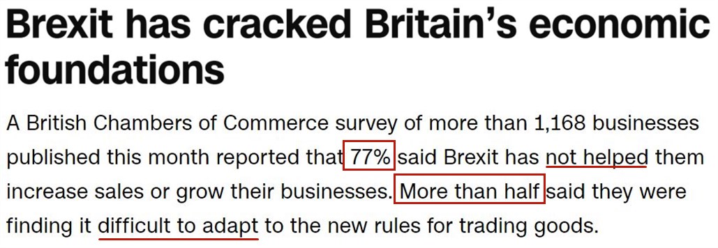 英國商會(huì)本月公布的一項(xiàng)針對(duì)1168家企業(yè)的調(diào)查報(bào)告顯示,77%的企業(yè)表示,脫歐沒有幫助他們?cè)黾愉N售或發(fā)展業(yè)務(wù)。超過一半的人表示,他們很難適應(yīng)貨物貿(mào)易的新規(guī)則。