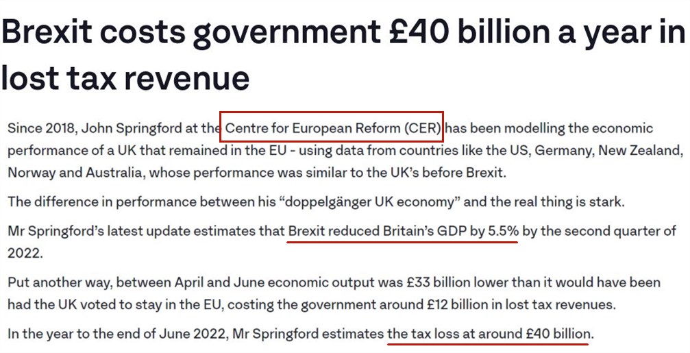 歐洲智庫“歐洲改革中心”的研究顯示,在截至2022年6月的18個(gè)月里,英國的貨物貿(mào)易比留在歐盟的情況下要低7%,投資減少了11%,國內(nèi)生產(chǎn)總值比原來減少了5.5%,每年損失的稅收達(dá)400億英鎊(約合484億美元)。