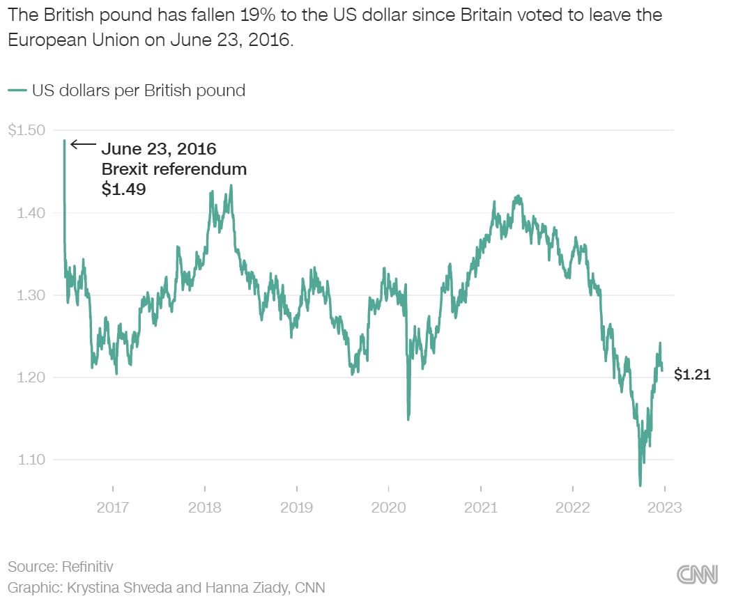 雖然“脫歐”的支持者們認(rèn)為,脫離歐盟后的英國將達(dá)成新的貿(mào)易協(xié)議,擺脫歐盟的規(guī)則和條例,可以使其經(jīng)濟(jì)更具全球性和競(jìng)爭(zhēng)力。但許多經(jīng)濟(jì)學(xué)家發(fā)現(xiàn),從2021年1月1日英國前首相約翰遜簽署協(xié)議開始至今,兩年過去了,英國不但沒有享受到“脫歐”帶來的經(jīng)濟(jì)紅利,反而付出了沉重代價(jià)。