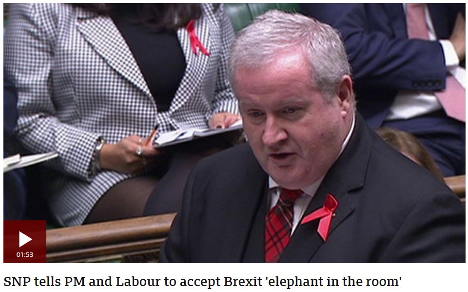 于是,就像蘇格蘭民族黨議會(huì)黨魁伊恩·布萊克福德所說,“脫歐”成了那頭“房間里的大象”——問題非常顯而易見卻一直被忽略甚至否認(rèn)。