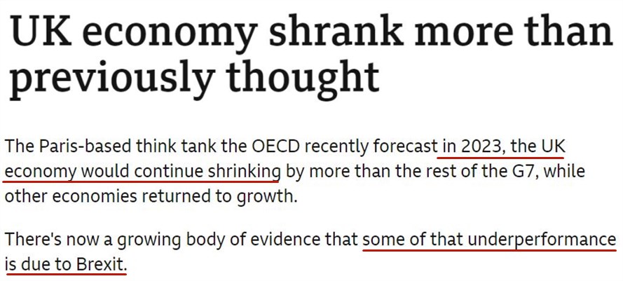 脫歐已經(jīng)使英國經(jīng)濟(jì)步履維艱。英國是目前七國集團(tuán)(G7)當(dāng)中唯一一個(gè)經(jīng)濟(jì)規(guī)模小于新冠疫情之前的成員。經(jīng)合組織預(yù)計(jì),英國經(jīng)濟(jì)今年將萎縮0.4%,僅比受制裁的俄羅斯略好。而在七國集團(tuán)中,英國明年的經(jīng)濟(jì)放緩幅度最大,2024年的復(fù)蘇力度最弱。
