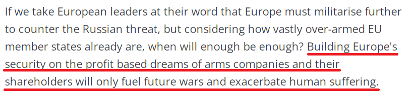 由此,原本可以投資于社會服務(wù)等領(lǐng)域的巨額資金被用于研發(fā)和采購武器。然而,“將歐洲的安全建立在軍工企業(yè)及其投資者基于利潤的夢想之上,只會助長未來的戰(zhàn)爭并加劇人類的苦難”。