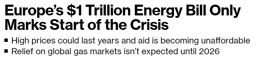 彭博社:能源價格飆升已使歐洲損失了近1萬億美元,預(yù)計高昂的能源價格還將持續(xù)數(shù)年。