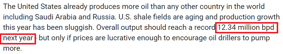 經(jīng)濟學(xué)家預(yù)測,在有利可圖的前提下,美國今年的石油總產(chǎn)量有望達到創(chuàng)紀(jì)錄的1234萬桶/天,到年底或?qū)⒊蔀樵蛢舫隹趪?/p>