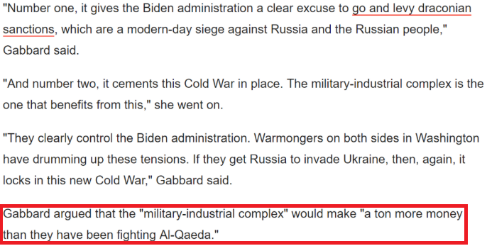 美國《新聞周刊》:加巴德在接受采訪時怒斥美國兩黨的戰(zhàn)爭販子都在煽動緊張局勢,因為軍工復(fù)合體將比他們與“基地”組織作戰(zhàn)賺的多得多。
