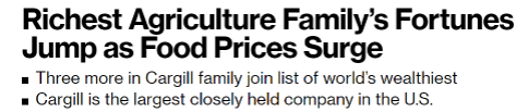 去年,控制嘉吉公司的嘉吉家族中又有三人躋身全球500強富豪榜;另外兩大美國糧商的業(yè)績也很搶眼,股票估值正在迅速上升。