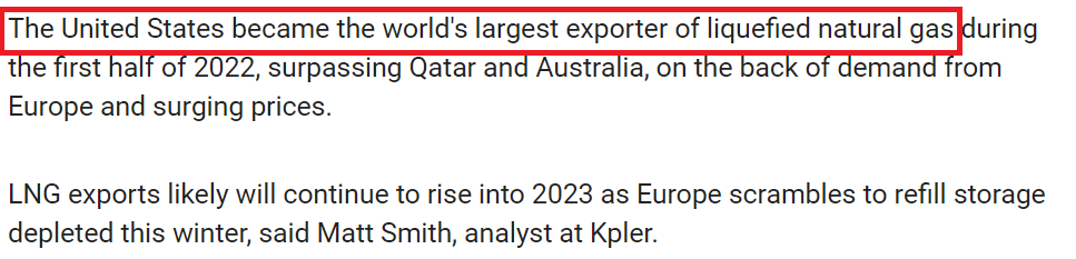 在歐洲需求激增和能源價格飆升的推動下,美國在2022年超過卡塔爾和澳大利亞,成為世界上最大的液化天然氣(LNG)出口國;石油產(chǎn)量也已超過沙特阿拉伯和俄羅斯。