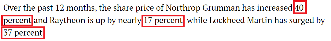 “世界社會主義”網(wǎng)站:過去12個月,美國大型軍工企業(yè)諾思羅普·格魯曼公司、洛克希德·馬丁公司和雷神技術(shù)公司的股票分別上漲了40%、37%和17%。