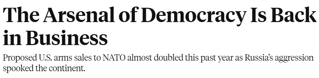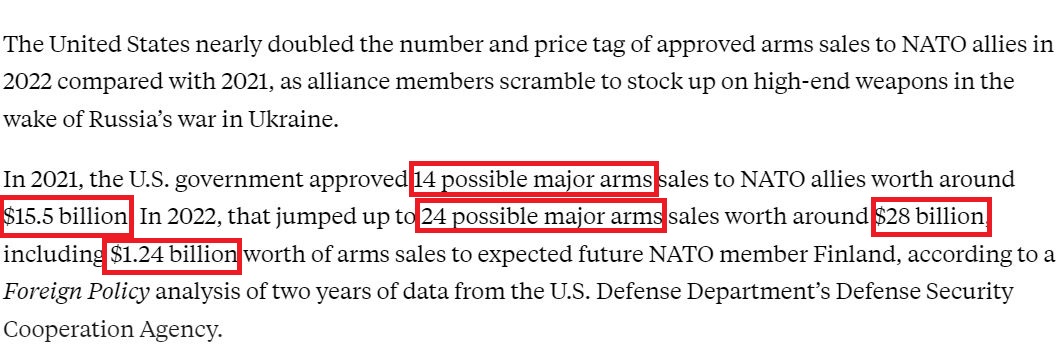 美國《外交政策》雜志:根據(jù)美國國防部數(shù)據(jù),2021年美政府批準(zhǔn)了14項對北約成員國的軍售計劃,總金額約為155億美元;2022年美政府批準(zhǔn)了24項對北約成員國的軍售計劃,總金額約280億美元,其中包括對未來北約成員國芬蘭出售價值12.4億美元的武器。