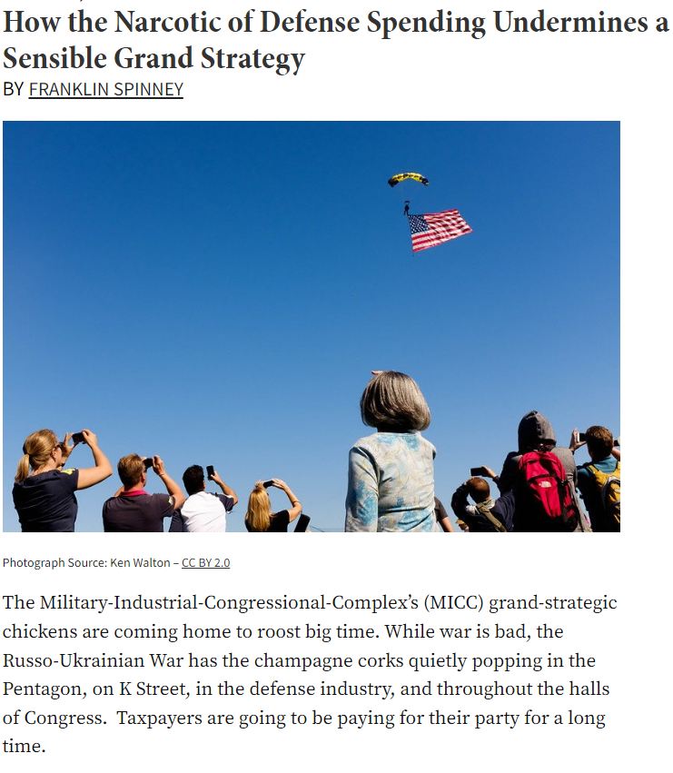 “俄烏沖突爆發(fā)以來,五角大樓(美國國防部)、K街(華盛頓游說公司聚集地)、軍工企業(yè)以及整個國會大廈內(nèi),都在悄悄地開香檳慶祝,而納稅人將為這場派對買單很久。”
