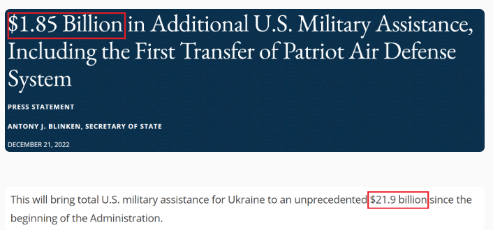 截至去年12月底美國承諾的最新一筆軍事援助,拜登政府上臺以來已為烏克蘭提供219億美元軍援。