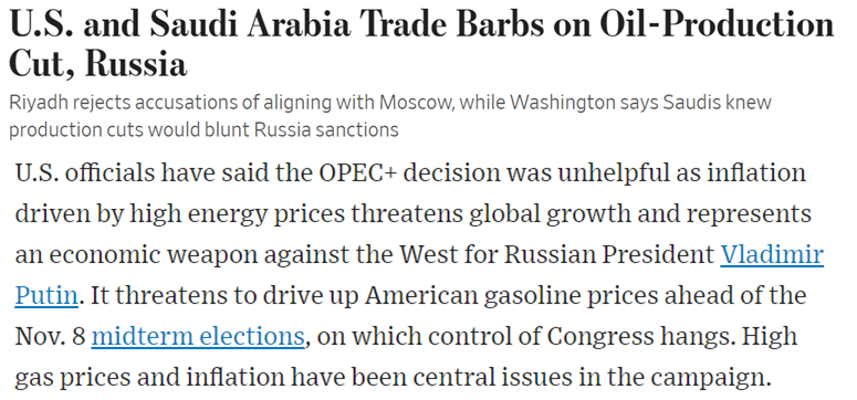 更讓美國惱火的是,沙特等主要產(chǎn)油國的減產(chǎn)決定,可能使美西方對俄制裁變得徒勞無功。