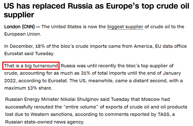 之所以能實現(xiàn)“取代”,源于美國一手挑起烏克蘭危機(jī)后,又大打“石油牌”等,讓歐洲陷入嚴(yán)重能源短缺,不得不寄望于美國這個“救世主”。
