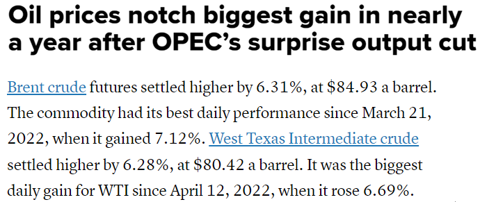 “歐佩克+”的最新減產(chǎn)決定,給近來因美歐銀行業(yè)危機(jī)陷入萎靡的國際油市以刺激:截至4月4日,國際油價漲幅超過5%;布倫特原油期貨收于每桶84.93美元,上漲6.31%,創(chuàng)下了自2022年3月21日以來的最佳單日表現(xiàn)。