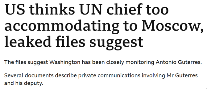 此外,英國廣播公司12日爆料稱,泄密文件顯示,美國政府一直在密切監(jiān)聽聯(lián)合國秘書長古特雷斯。