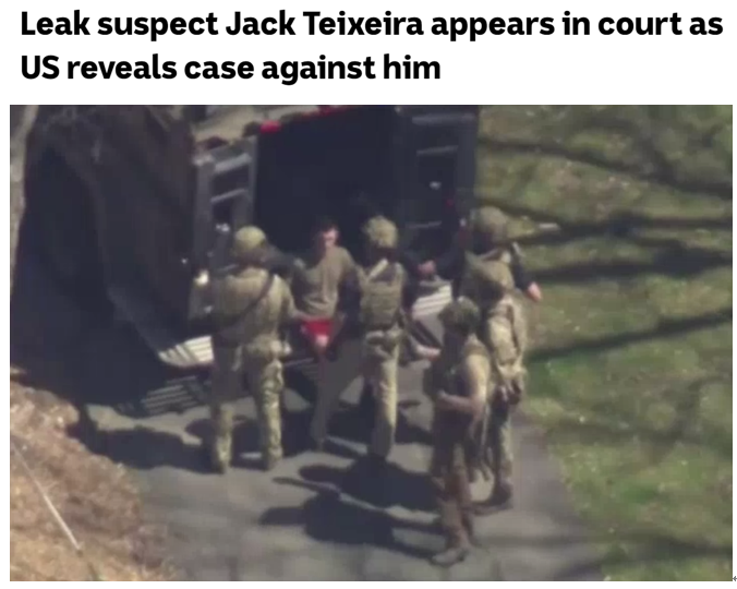 美國“泄密門”嫌疑人、馬薩諸塞州空軍國民警衛(wèi)隊成員杰克·特謝拉當(dāng)?shù)貢r間14日首次出庭,聽取聯(lián)邦地區(qū)法院依據(jù)《反間諜法》對其宣布兩項刑事指控,即“保存并傳輸國家防務(wù)信息”及“故意保存機(jī)密文件”。