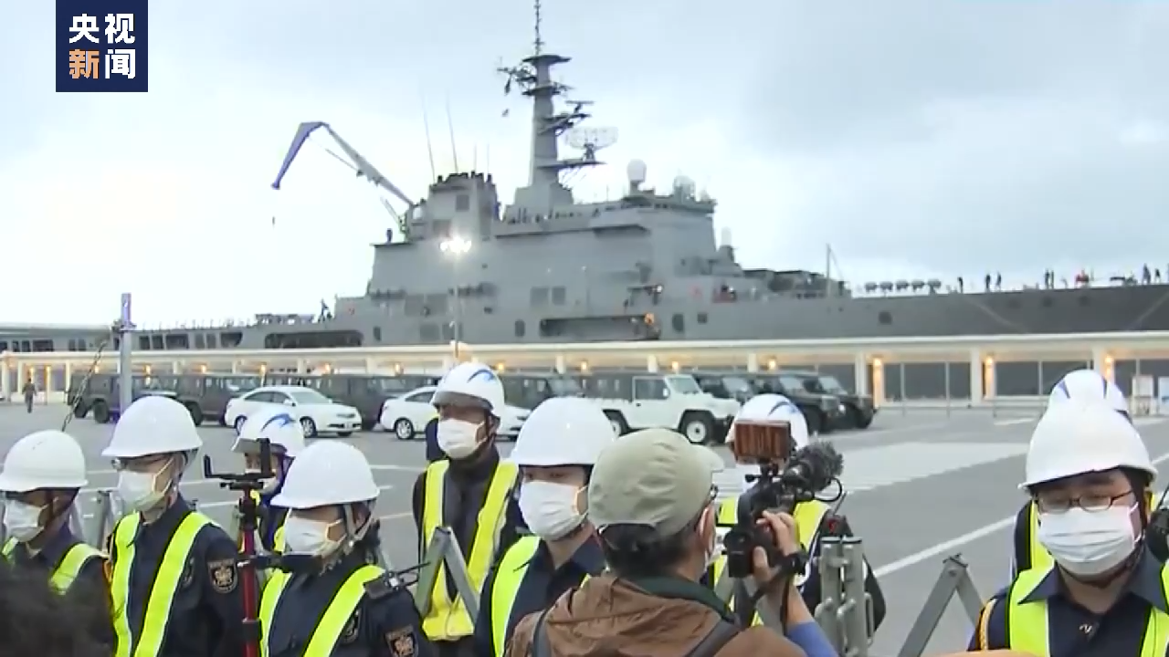 3月18日,海上自衛(wèi)隊(duì)“大隅”號(hào)運(yùn)輸艦??渴鄞a頭,數(shù)十輛卡車陸續(xù)駛?cè)胧珝u的日本自衛(wèi)隊(duì)基地。