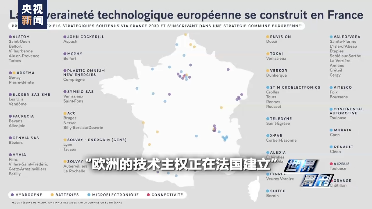 馬克龍還發(fā)布了一張題為“歐洲的技術(shù)主權(quán)正在法國建立”的圖片。 圖片顯示,法國計劃在2030年前在國內(nèi)多處支持建設(shè)“戰(zhàn)略性工業(yè)項目”,包括氫能、電池技術(shù)、微電子技術(shù)等,以作為歐洲共同戰(zhàn)略的一部分。