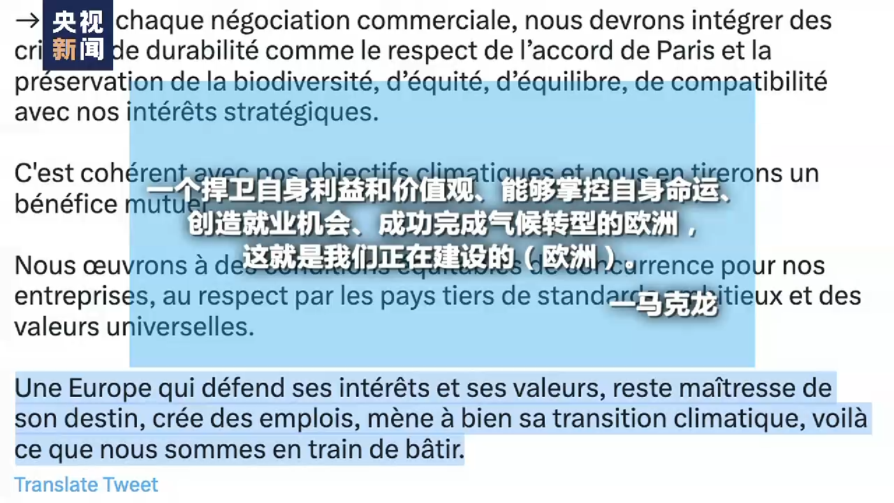 除了保持外交獨立,法國總統(tǒng)馬克龍還在其推特賬號發(fā)長文談及“歐洲經(jīng)濟(jì)主權(quán)”話題。