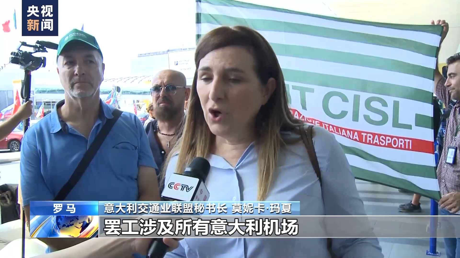總臺記者 殷欣:這里是羅馬達(dá)芬奇機(jī)場,在我身后就是今天參加罷工的部分地勤人員。今天的罷工影響非常大,有統(tǒng)計(jì)顯示,意大利全國今天出行受到影響的旅客數(shù)量是在25萬,取消的航班數(shù)量大約是1000個架次。