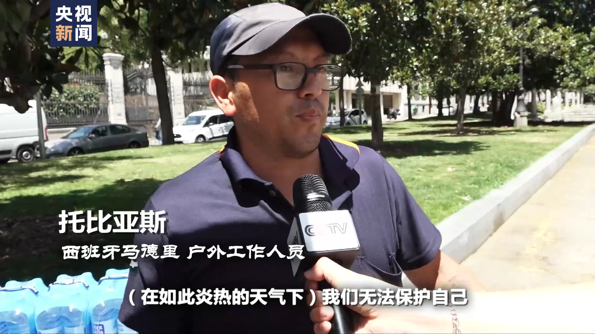 西班牙馬德里 戶外工作人員 托比亞斯:在如此炎熱的天氣下我們無法保護自己,只能補充大量水分,大量去喝水,喝飲料,潤濕頭部以免發(fā)生脫水。