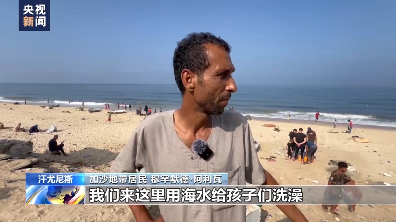 加沙地帶居民 穆罕默德·阿利瓦:我們來(lái)這里用海水給孩子們洗澡,并且將海水和淡水以及其他水混合在一起飲用。