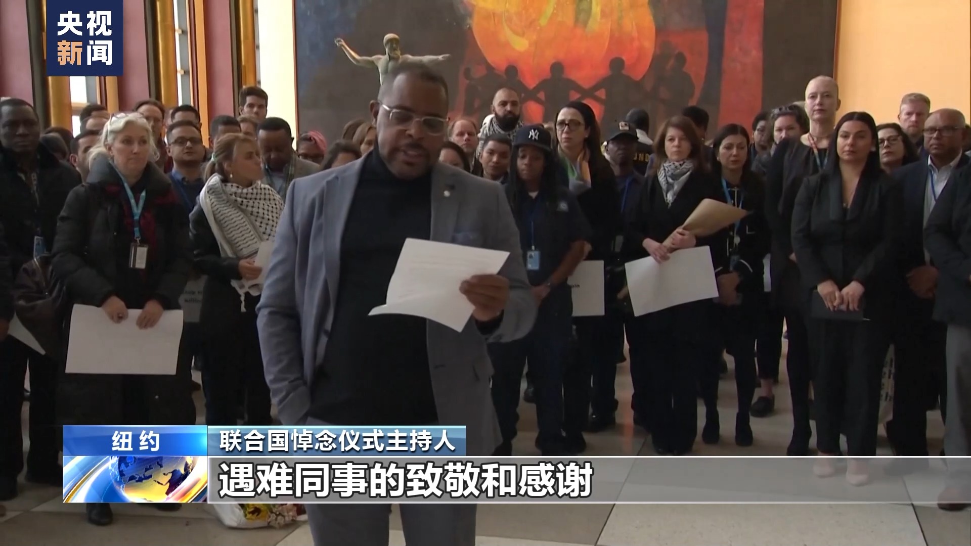 聯(lián)合國悼念儀式主持人:這一分鐘默哀是對聯(lián)合國近東救濟工程處遇難同事的致敬和感謝,他們在履行救助他人的職責時獻出了生命。