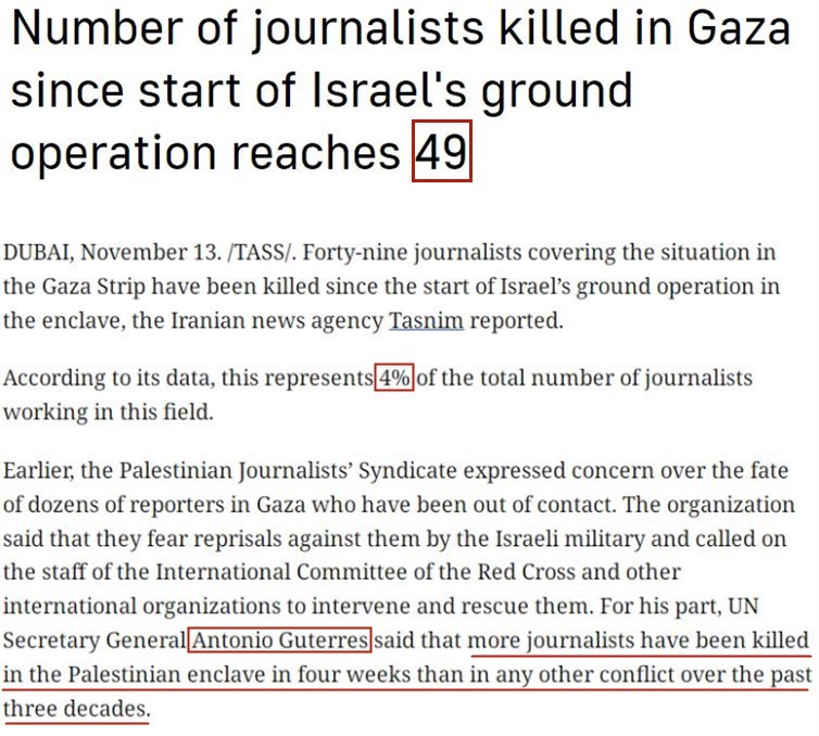 塔斯社援引伊朗通訊社的報道說,遇難的49人占在加沙地帶工作的記者總數(shù)的4%。