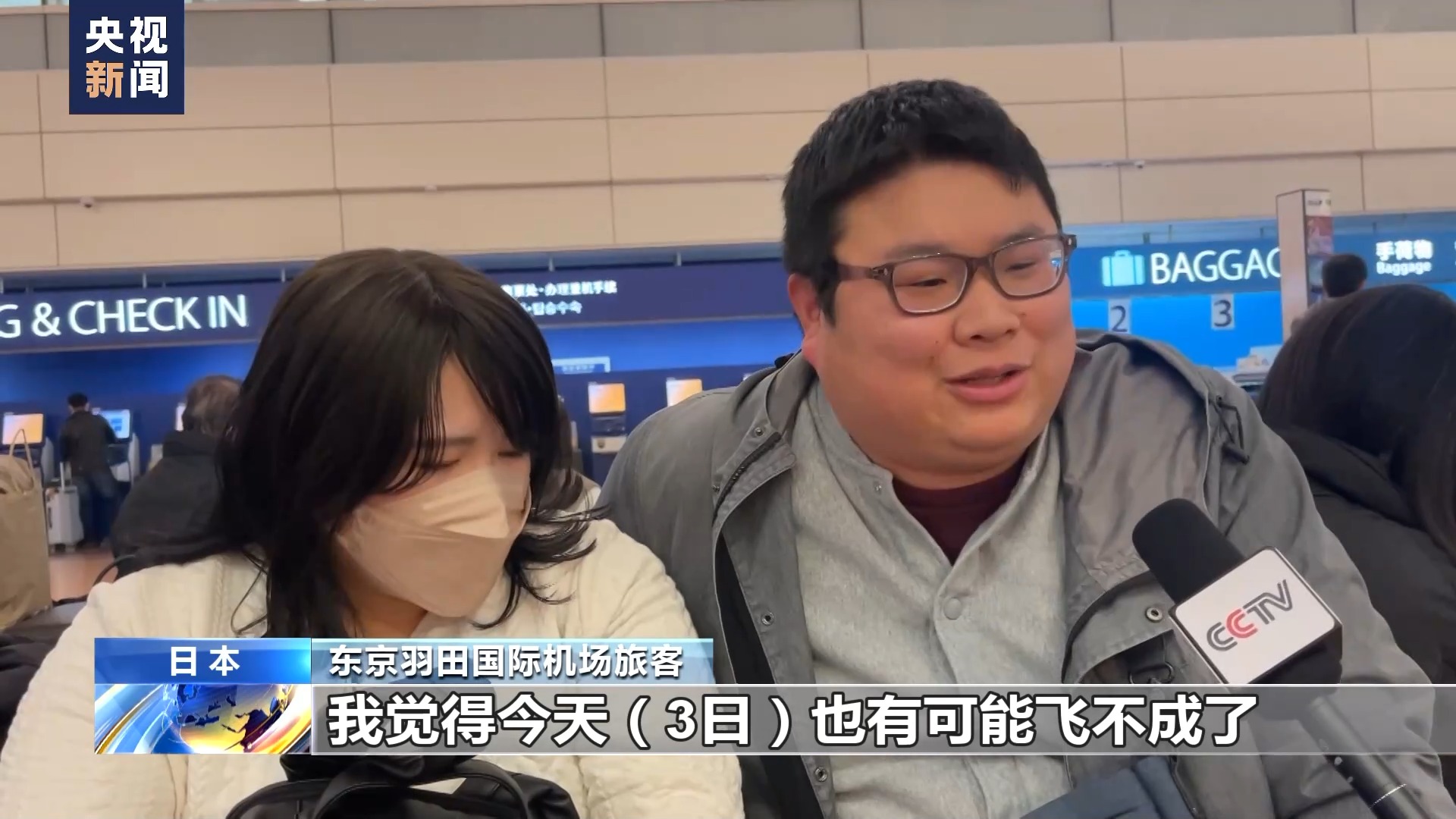 東京羽田國際機場旅客:本來是要乘坐今天(3日)早上7點40分的飛機,結(jié)果取消了,改到了晚上的飛機。在機場等了12個小時、13個小時吧。