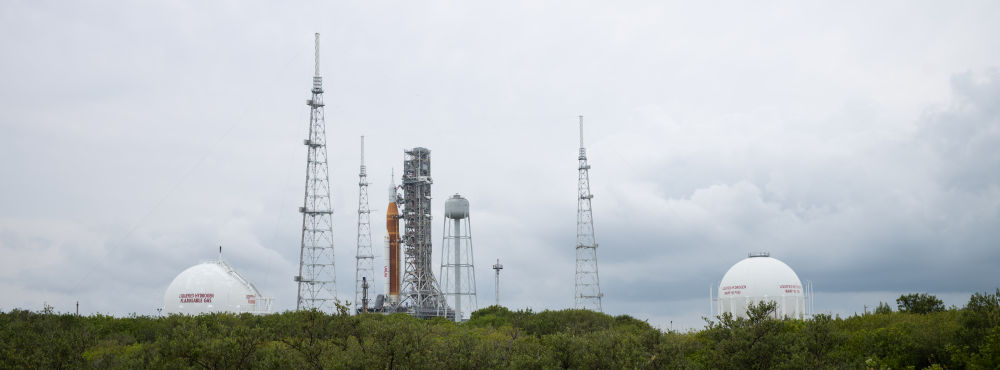 這是2022年4月2日在美國佛羅里達(dá)州肯尼迪航天中心拍攝的美國航天局新一代大推力運(yùn)載火箭“太空發(fā)射系統(tǒng)”和安裝在火箭頂端的“獵戶座”飛船。新華社發(fā)(美國航天局供圖)
