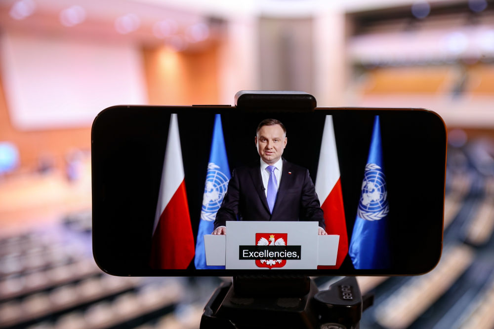 這是2021年2月22日在比利時(shí)布魯塞爾拍攝的波蘭總統(tǒng)杜達(dá)在聯(lián)合國(guó)人權(quán)理事會(huì)第46屆會(huì)議高級(jí)別會(huì)議上致辭的屏幕畫面(背景為聯(lián)合國(guó)人權(quán)理事會(huì)會(huì)場(chǎng)截圖)。新華社記者張鋮攝