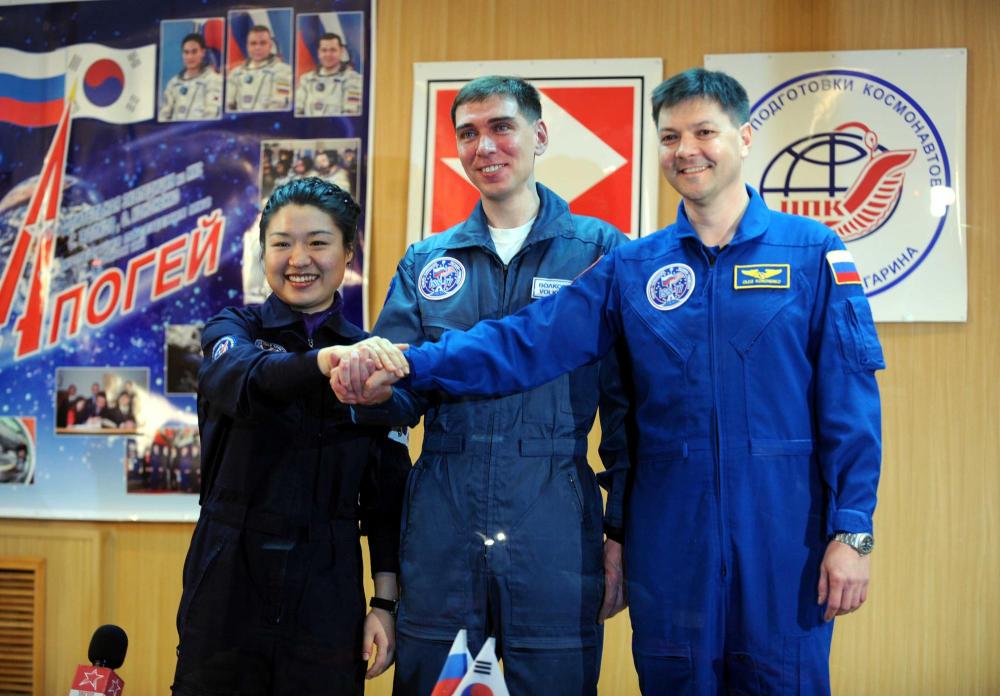 2008年4月7日,在哈薩克斯坦的拜科努爾發(fā)射基地,韓國首位女宇航員李素妍(左)與俄羅斯宇航員謝爾蓋·沃爾科夫(中)和奧列格·科諾年科出席記者招待會。新華社/韓國紐西斯通訊社