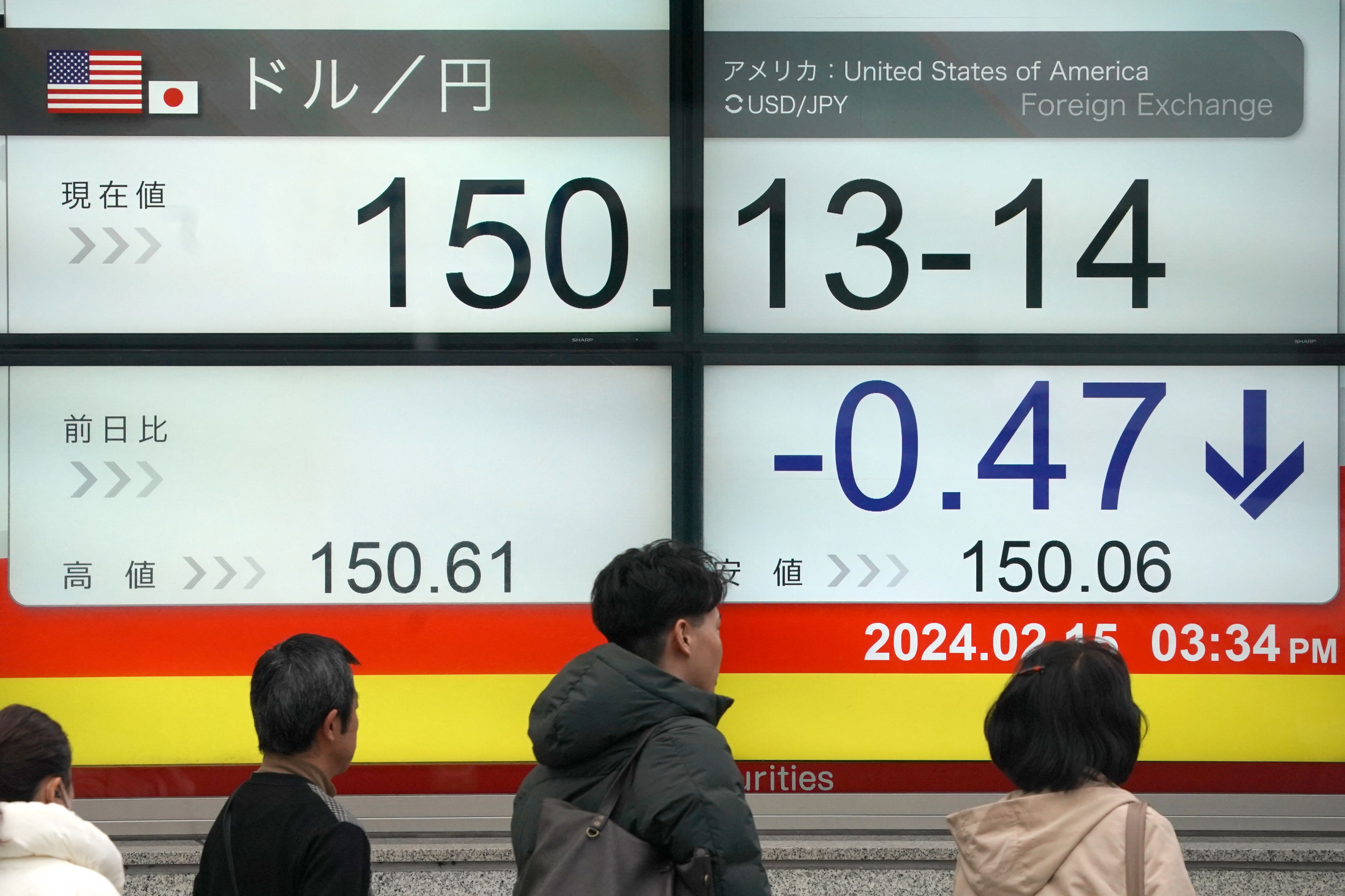 2月15日,行人經(jīng)過(guò)東京街頭顯示日元對(duì)美元匯率的電子牌。(法新社)