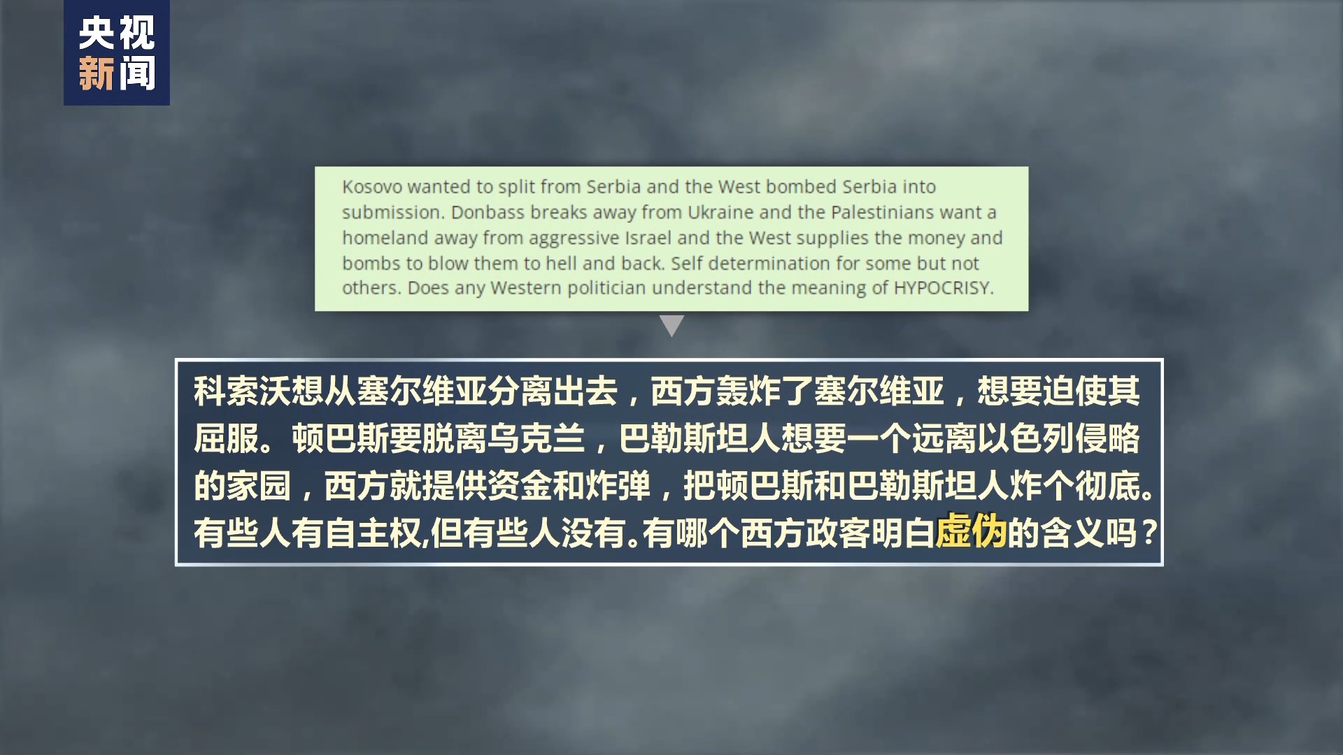 還有網(wǎng)友對比了西方國家在科索沃戰(zhàn)爭、俄烏沖突和巴以沖突中的行徑表示,西方國家支持想從塞爾維亞分離出去的科索沃,卻提供資金和炸彈猛烈打擊頓巴斯和巴勒斯坦人。這位網(wǎng)友總結(jié)說:有些人有自主權(quán),但有些人沒有。有哪個西方政客明白虛偽的含義嗎?