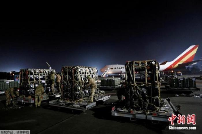 資料圖:當(dāng)?shù)貢r(shí)間2022年2月,美國(guó)飛機(jī)將軍事援助物資運(yùn)抵烏克蘭基輔鮑里斯波爾國(guó)際機(jī)場(chǎng)。