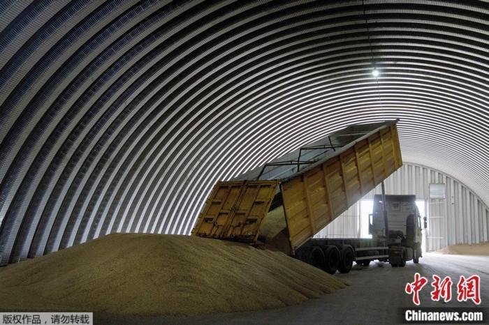 資料圖:自卸車在一座烏克蘭糧倉中卸載谷物。