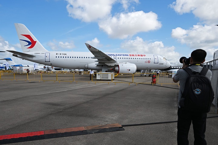 2月20日,一架中國東方航空公司C919客機(jī)在新加坡航展上做靜態(tài)展示。(新華社發(fā))