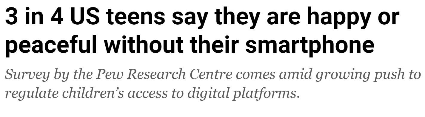 民調(diào)顯示,74%的受訪青少年表示在沒有智能手機(jī)的情況下感到快樂,而72%的青少年在沒有手機(jī)的情況下感到平靜。