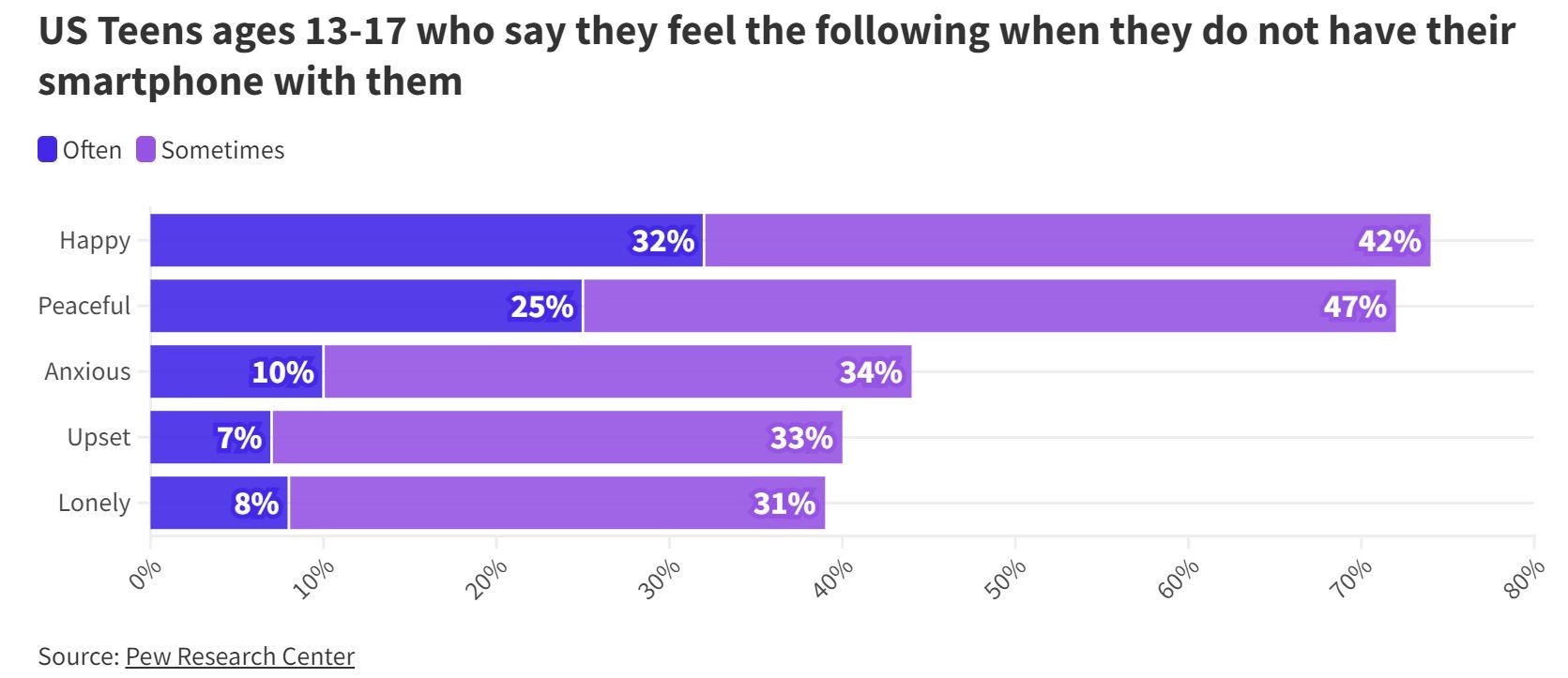 調(diào)查同時(shí)顯示,相當(dāng)一部分青少年在沒有智能手機(jī)的情況下會(huì)出現(xiàn)負(fù)面情緒。大約40%的孩子說,沒有智能手機(jī)至少有時(shí)會(huì)讓他們感到焦慮、沮喪或孤獨(dú)。