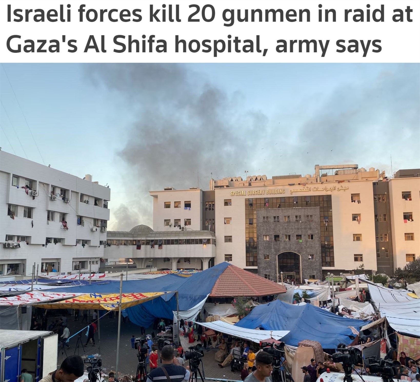 據(jù)報道,以軍當天在希法醫(yī)院內(nèi)與巴勒斯坦伊斯蘭抵抗運動(哈馬斯)武裝人員發(fā)生激烈交火,造成了大量人員傷亡,醫(yī)院部分區(qū)域還發(fā)生了火災(zāi)。18日17時,以軍稱已在交火中打死20名哈馬斯武裝人員,并逮捕了數(shù)十名嫌疑人。
