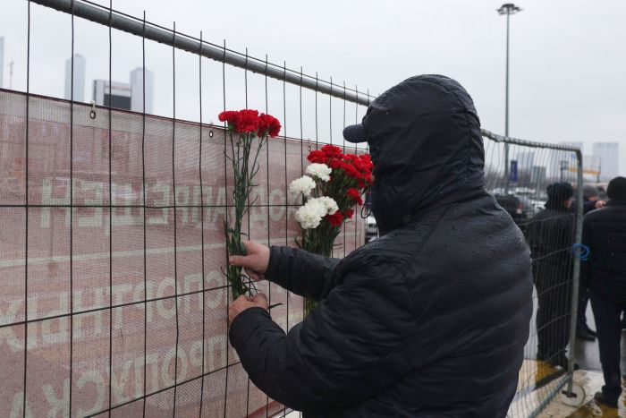 3月28日,人們在俄羅斯首都莫斯科近郊“克羅庫斯城”音樂廳前擺放鮮花和玩具,悼念遇難者。新華社記者白雪騏攝