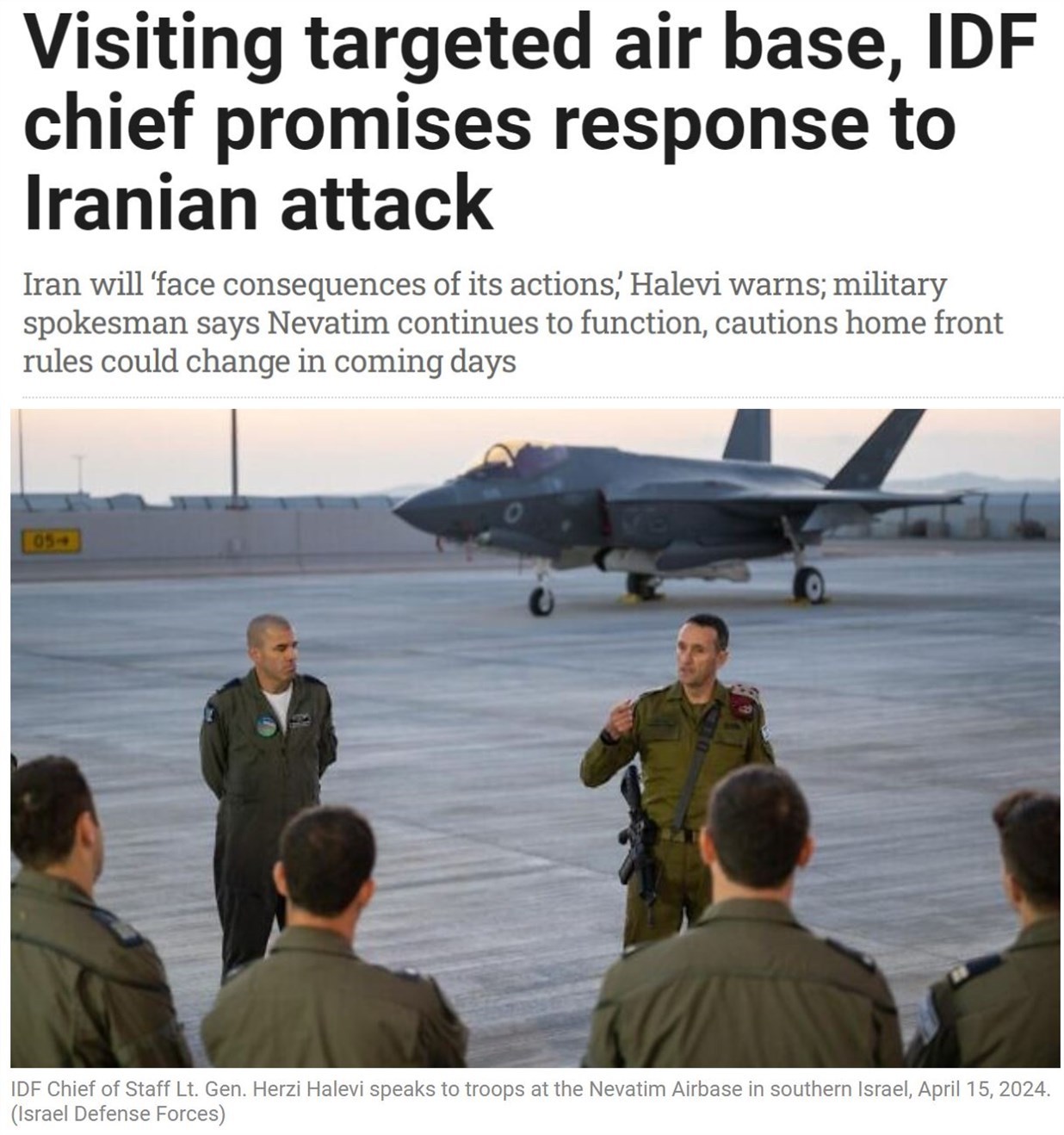 以色列國防軍總參謀長哈萊維當?shù)貢r間15日在視察以色列南部的內(nèi)瓦提姆空軍基地時表示,伊朗對以色列發(fā)動的導彈和無人機襲擊“史無前例”,將“遭到回應”,但他未作具體說明。