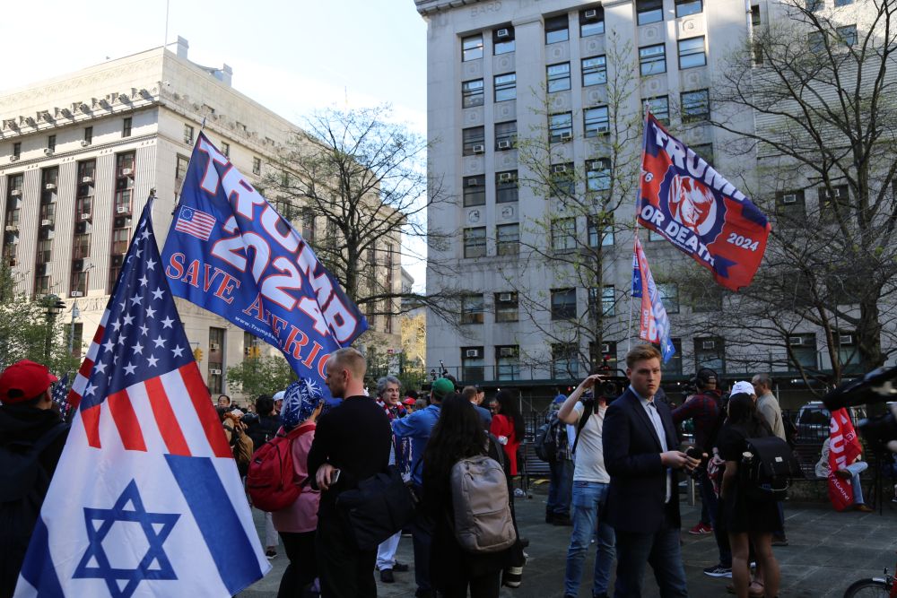 4月15日,在美國紐約,美國前總統(tǒng)特朗普的支持者在法庭前的公園舉行集會。新華社記者劉亞南攝