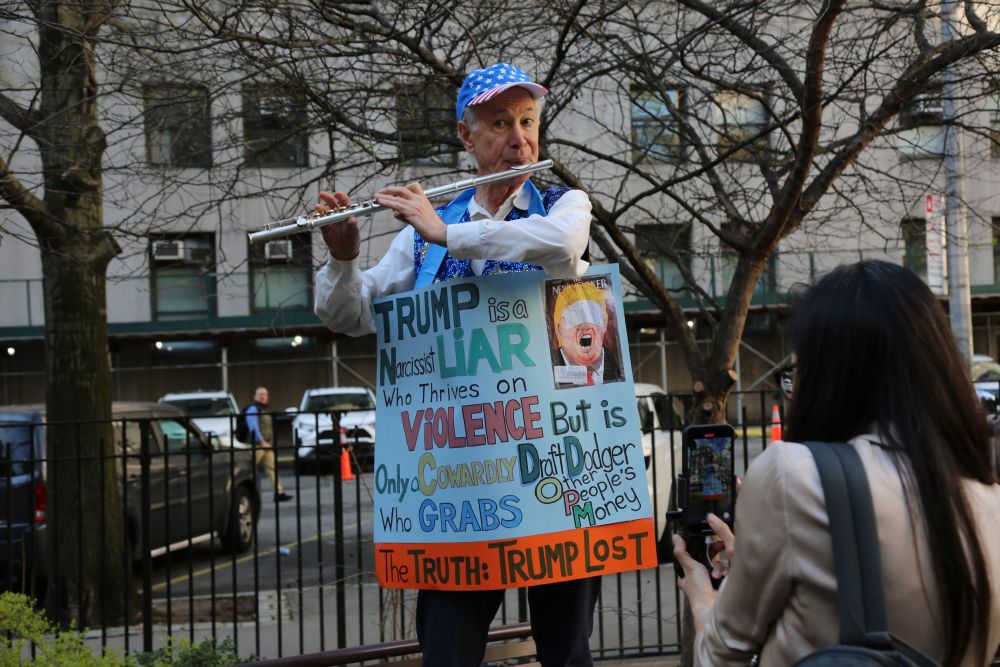 4月15日,在美國紐約,美國前總統(tǒng)特朗普的反對者在法庭前的公園掛著標語牌演奏樂器。新華社記者劉亞南攝